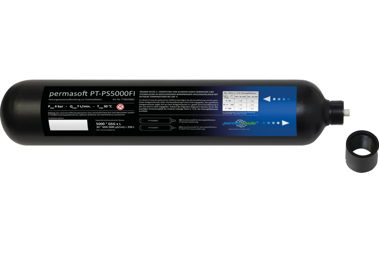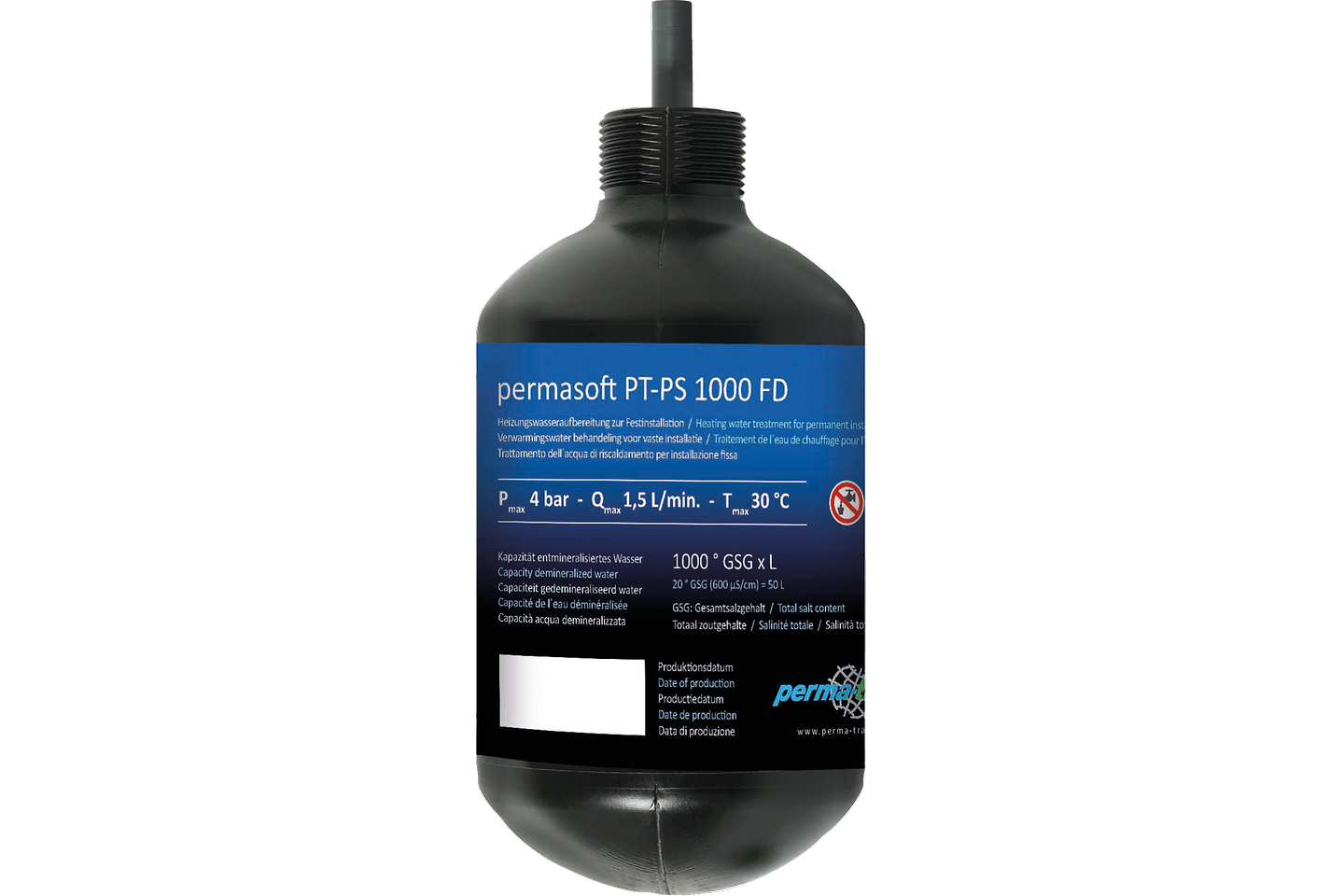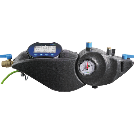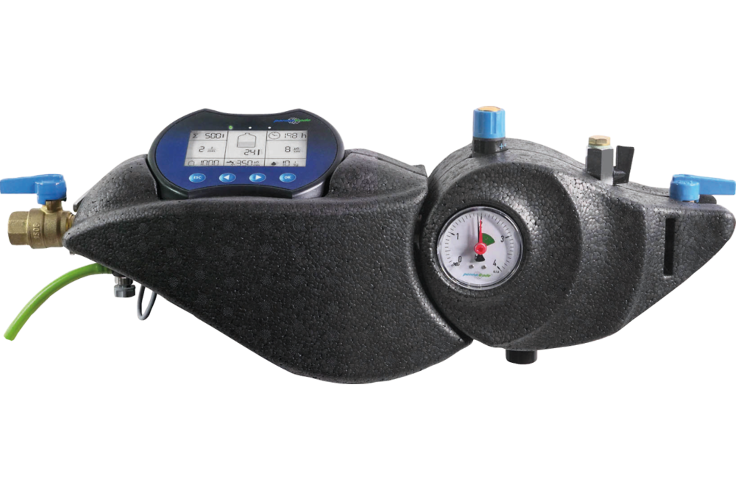 Digitale Heizungsbefüllstation PT-DB1000 / 5000 bestehend aus separaten ein- und ausgangsseitigen Absperrventilen, Systemtrenner BA mit Prüfhähnen und Abwasseranschluss, Druckminderer, Manometer, batteriebetriebene Elektronik mit 4-Zoll Display, Wasserzähler, Leitwertmessung, Dämmschalen und permasoft. Sie misst die Leitfähigkeit des Nachspeisewassers, überwacht die Kapazität der permasoft Entmineralisierungseinheit sowie die Füllmengen. Beim Überschreiten der permasoft Kapazität oder einer vorher festgelegten maximalen wöchentlichen Nachfüllmenge (Leckagewarnung) wird eine Meldung ausgegeben. Eine falsche Eingabe der permasoft Kapazität oder der einzugebenden Leitfähigkeit des Rohwassers hat keinen Einfluss auf die Qualität des Füllwassers.